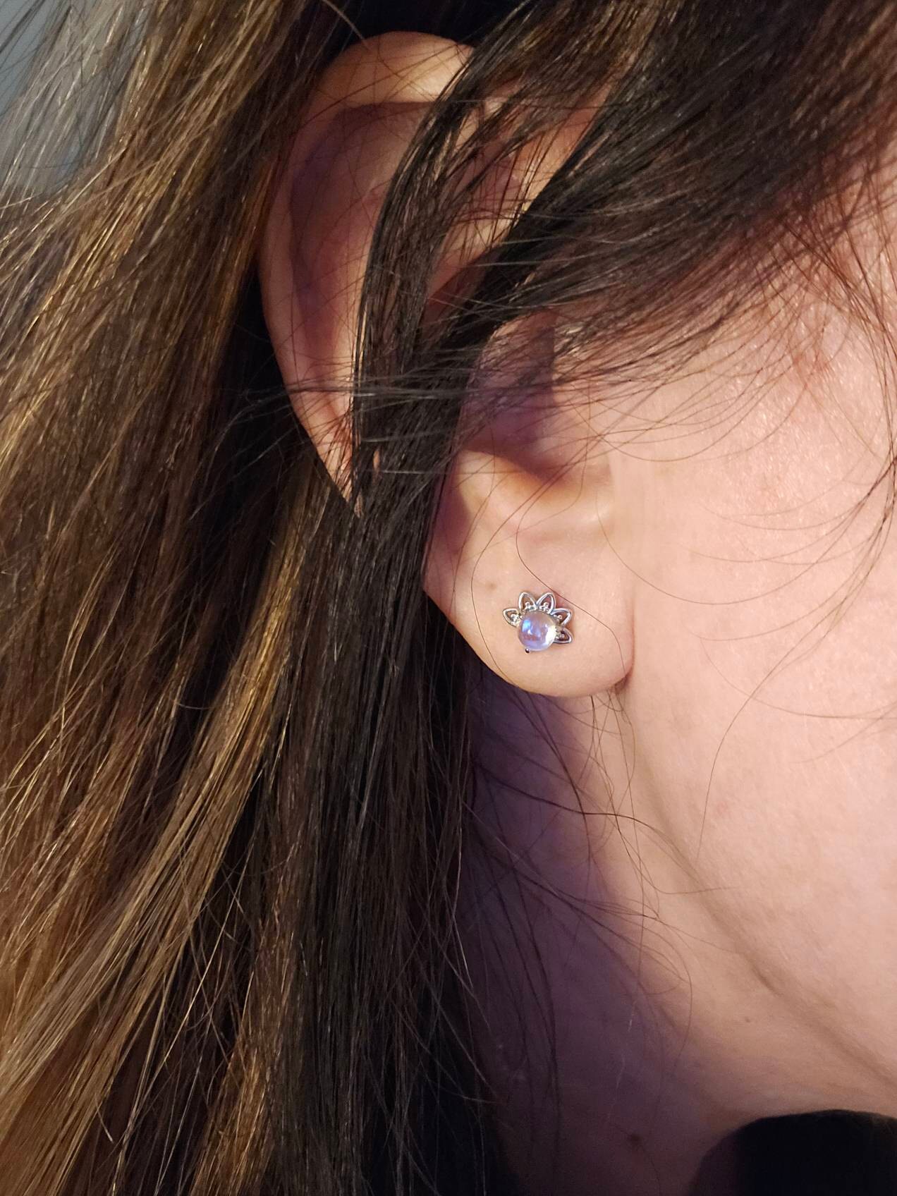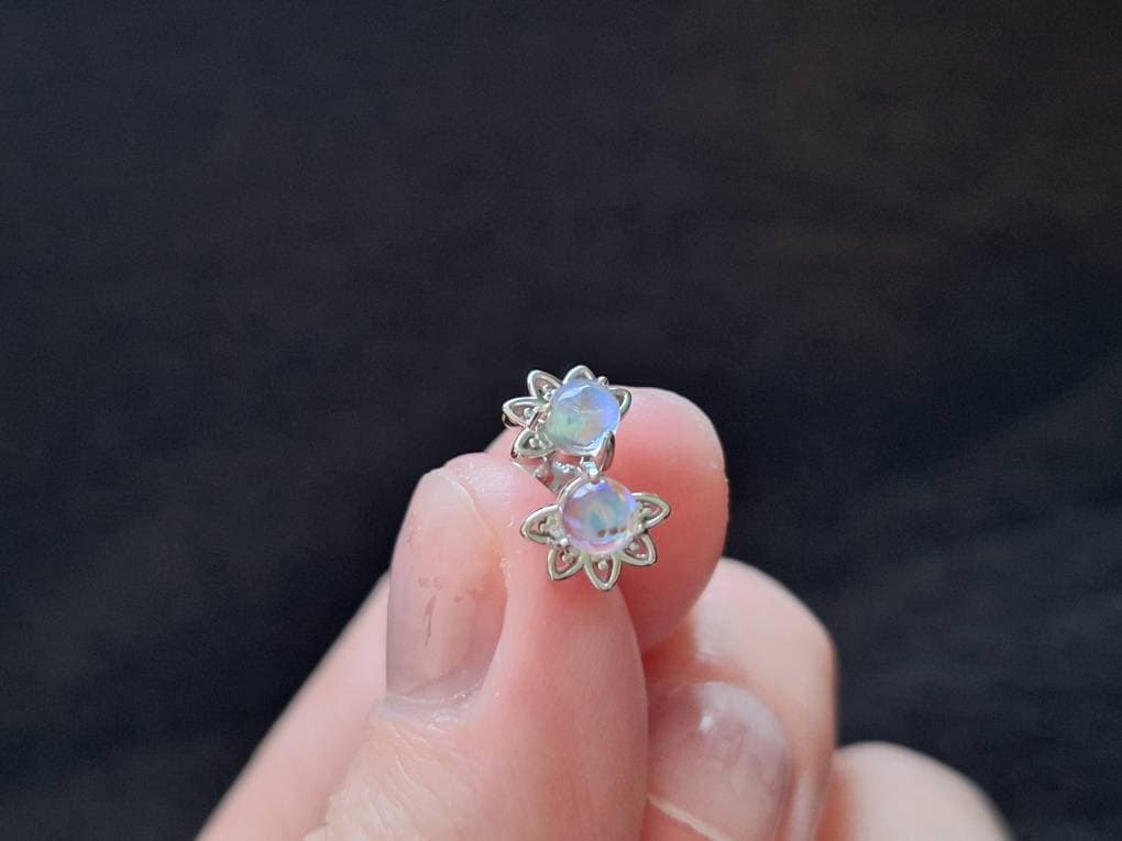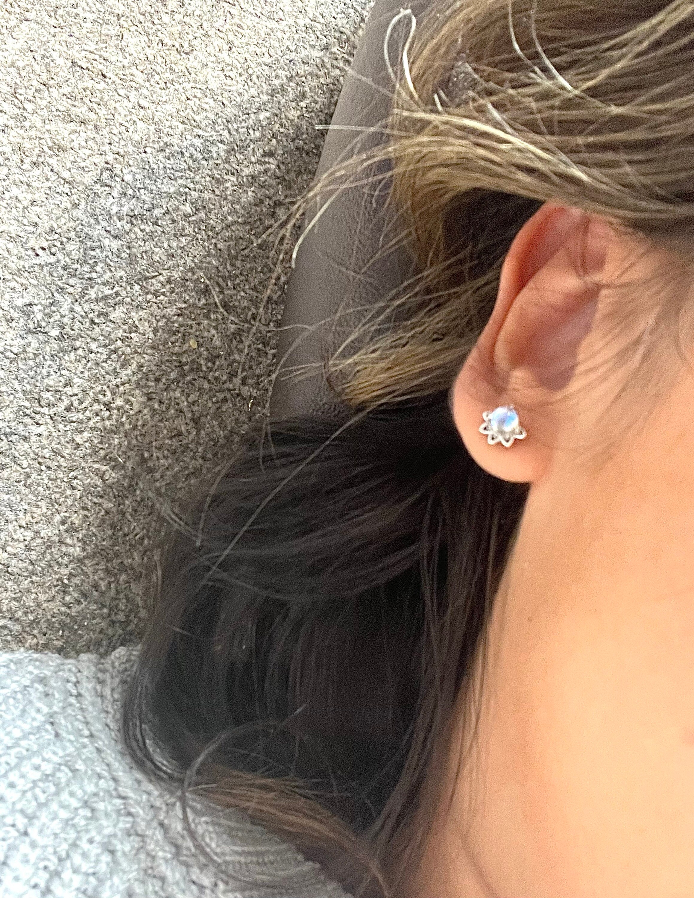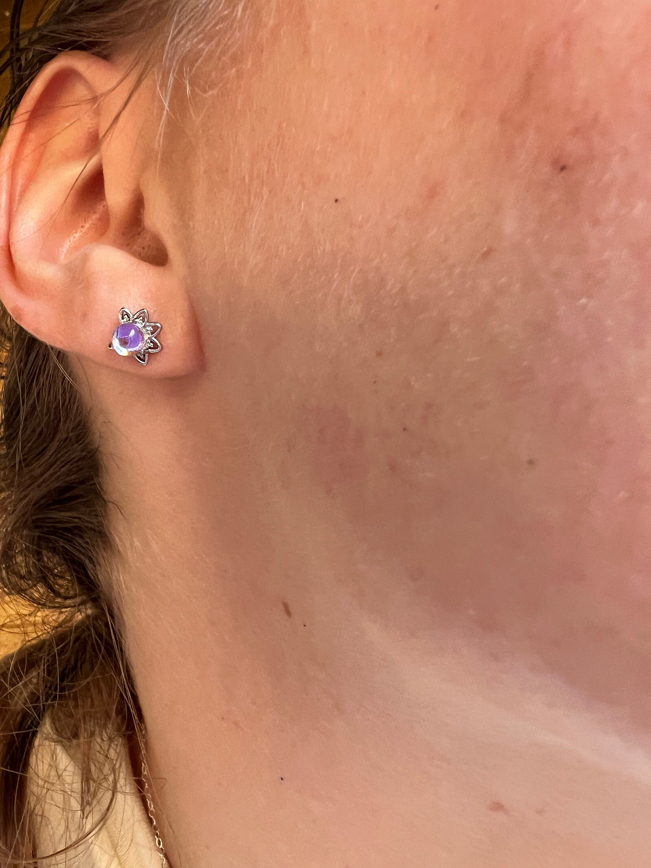 A simply exquisite pair of minimalist stud earrings with a stunning iridescent glow, perfect for everyday wear.