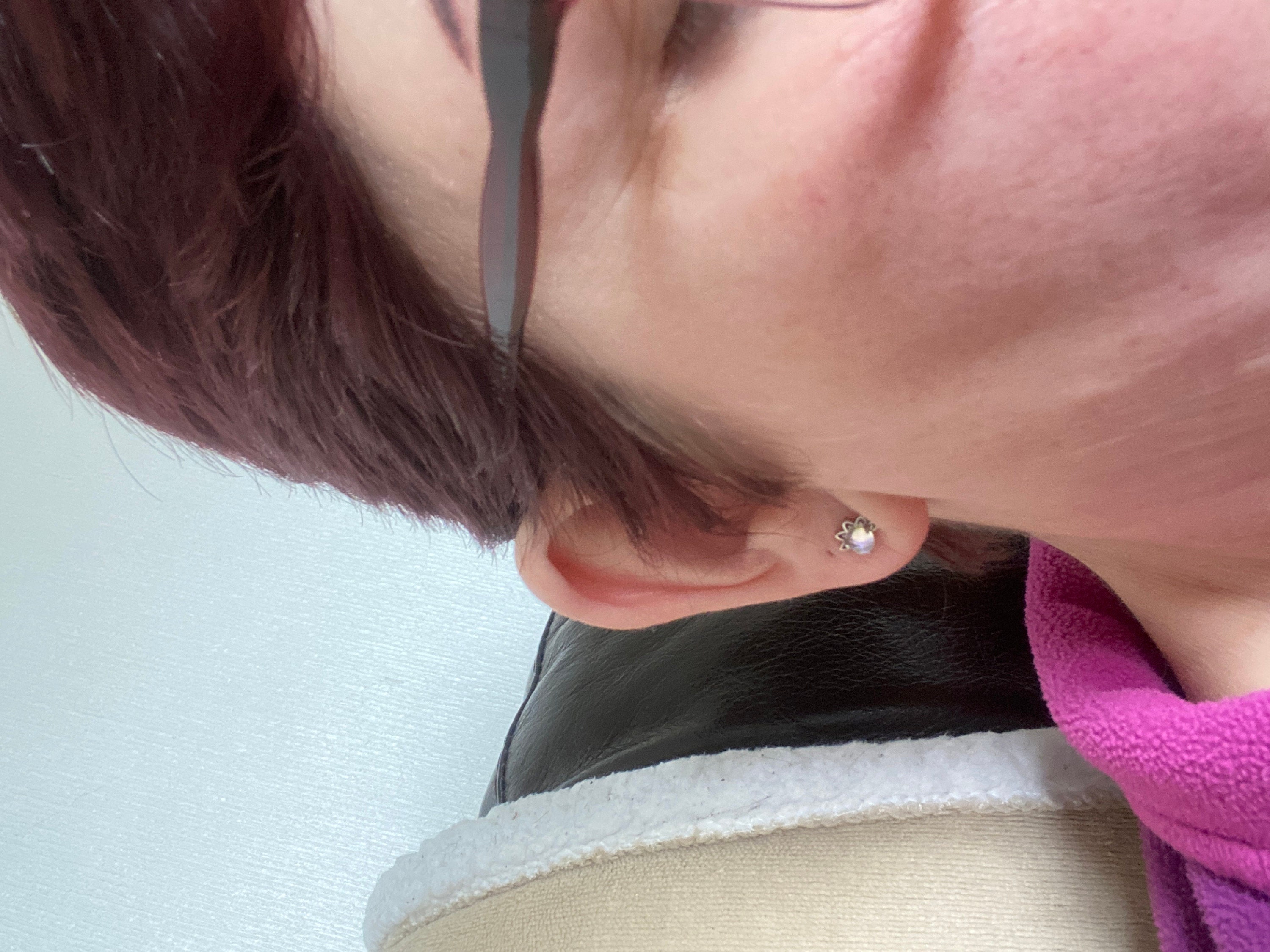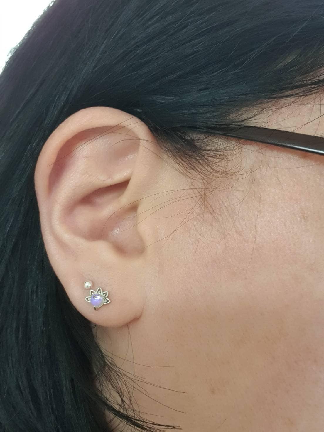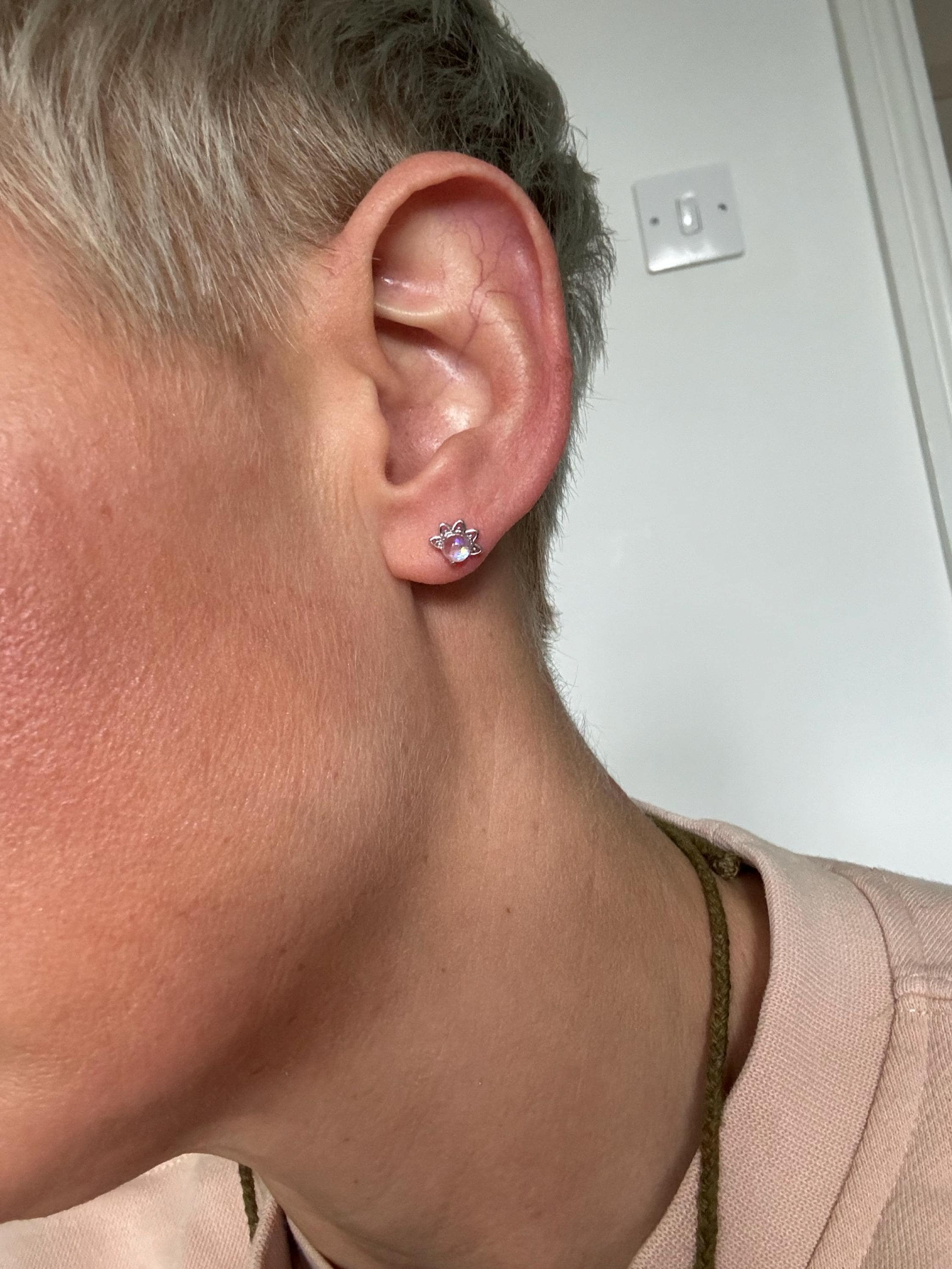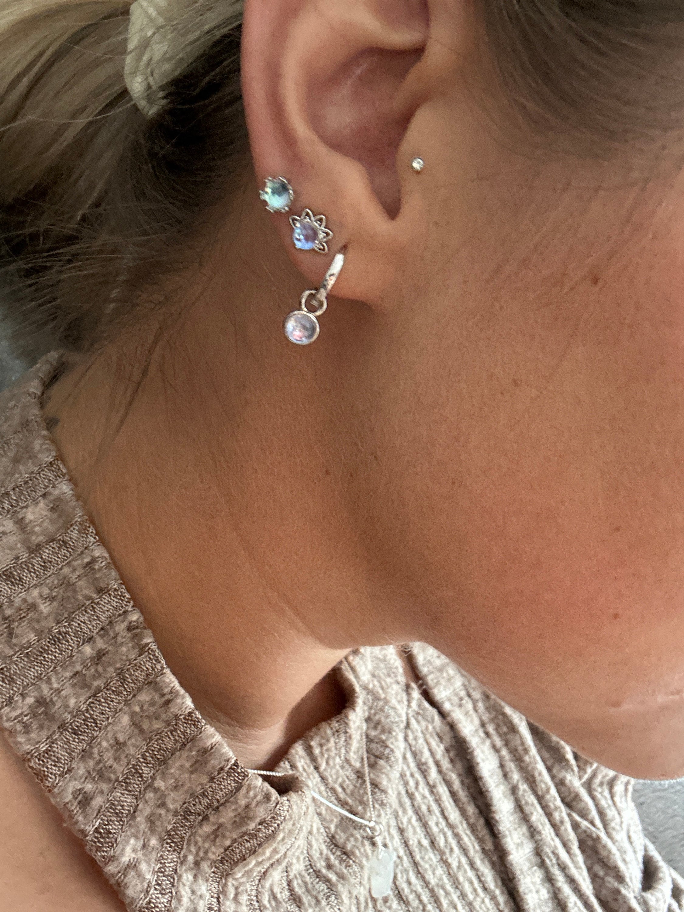 A simply exquisite pair of minimalist stud earrings with a stunning iridescent glow, perfect for everyday wear.