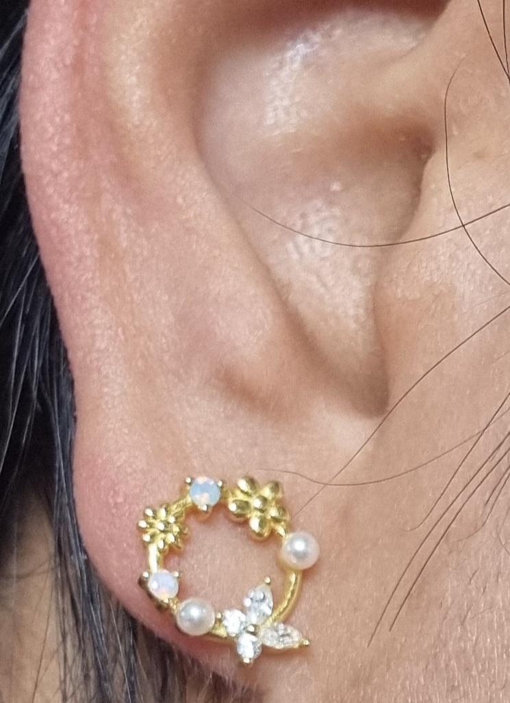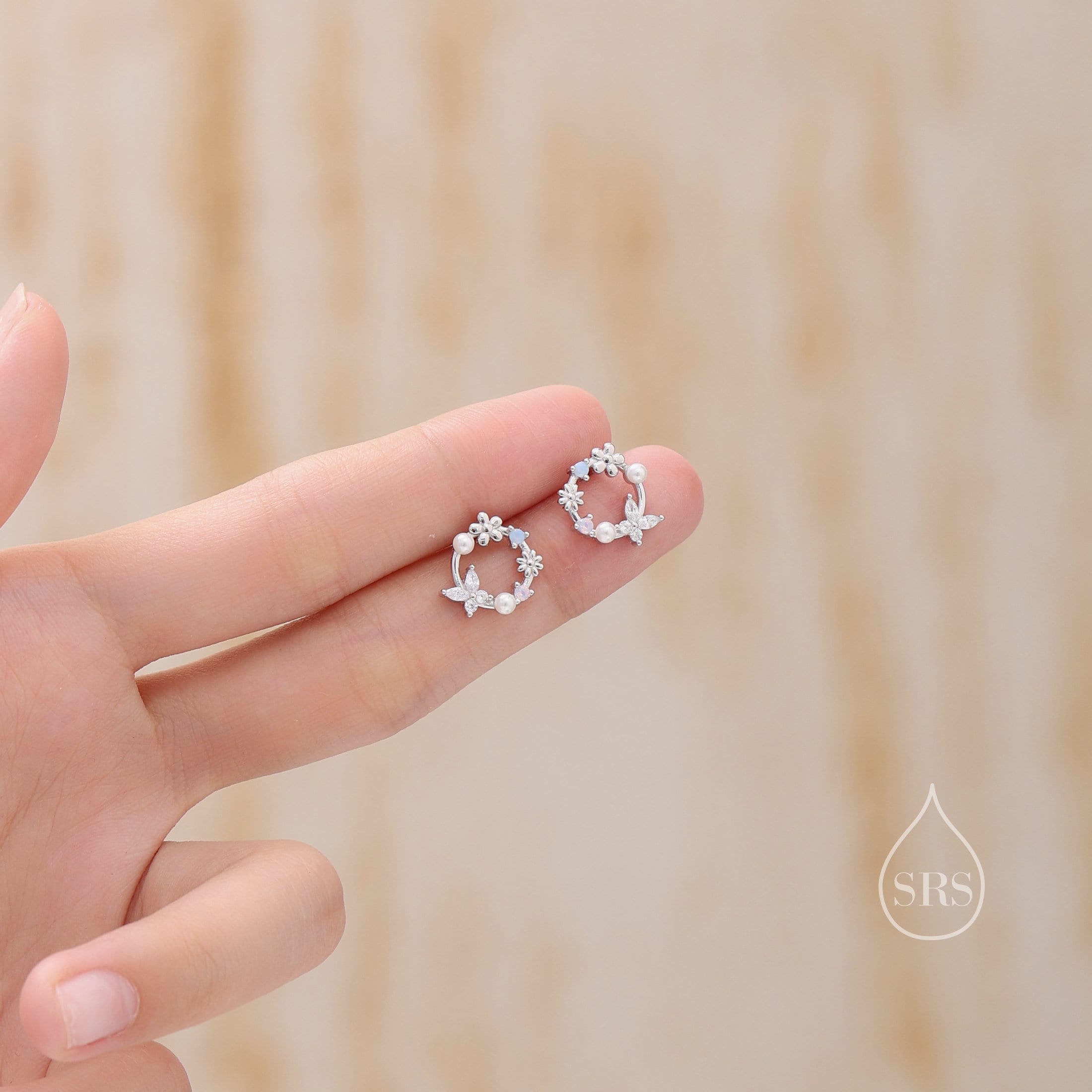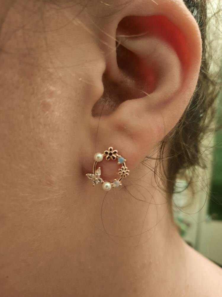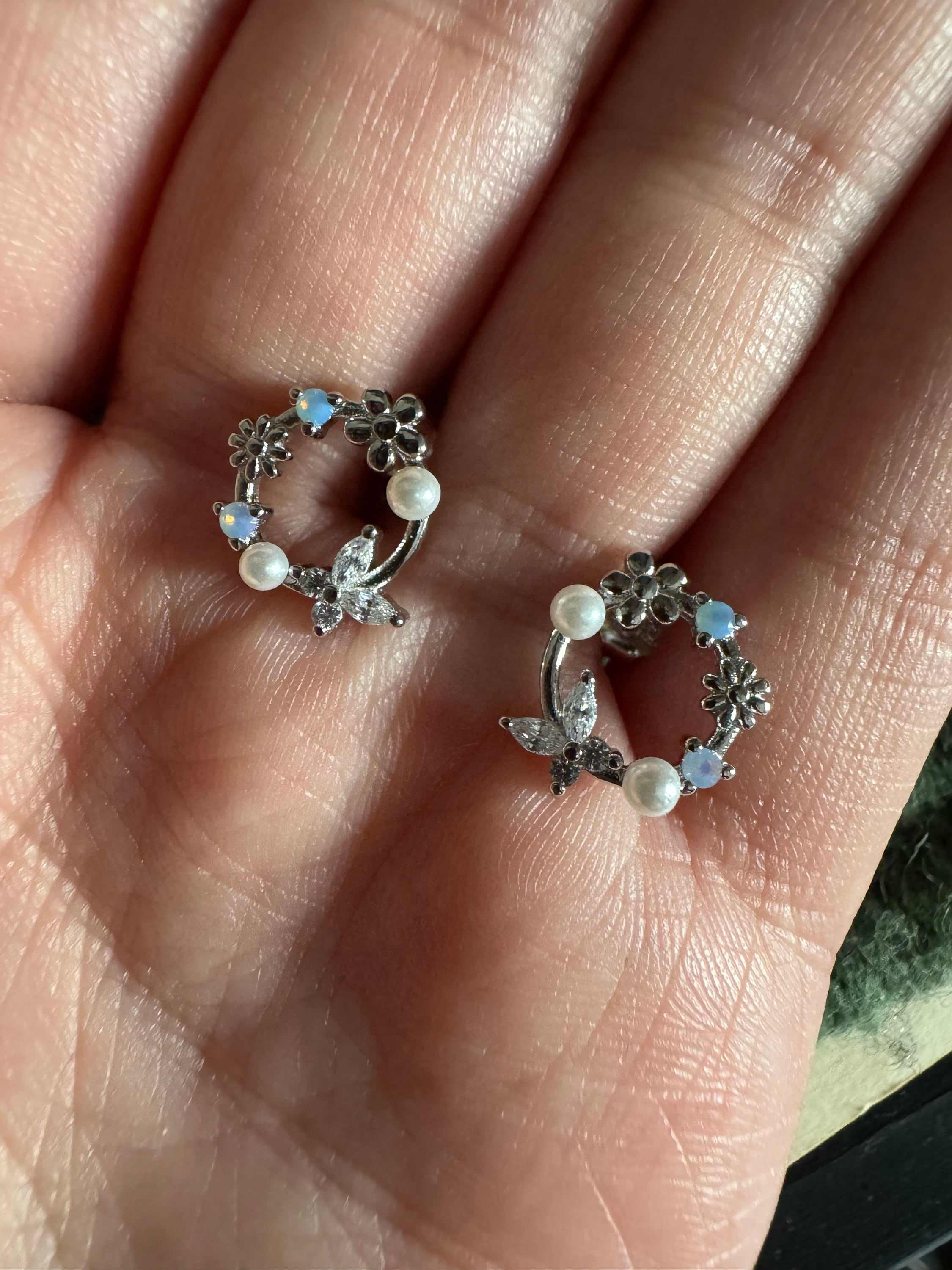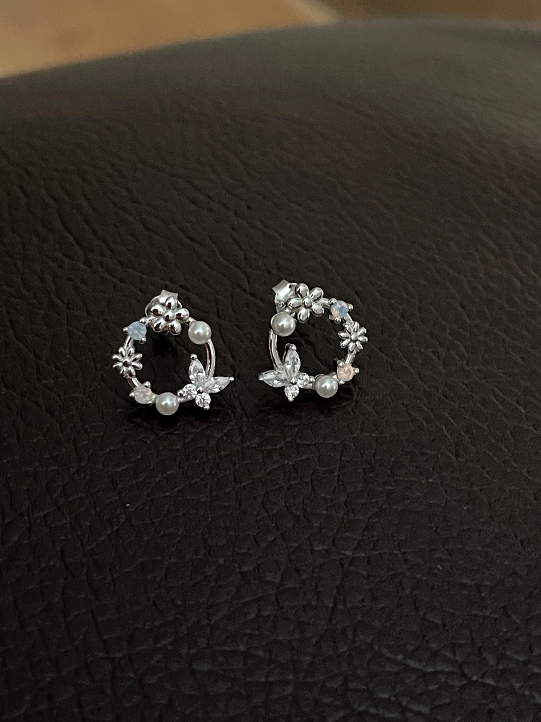 A pair of exquisite earrings in a wreath design. Sterling Silver Small Wreath Stud Earrings - Silver or Gold or Rose Gold, CZ Round Flower and Butterfly Stud Earrings