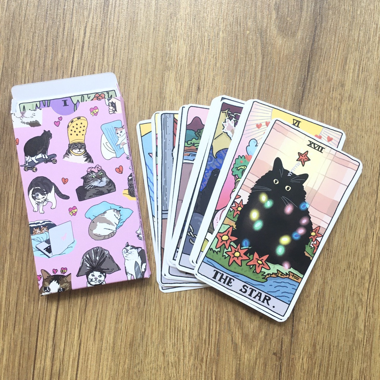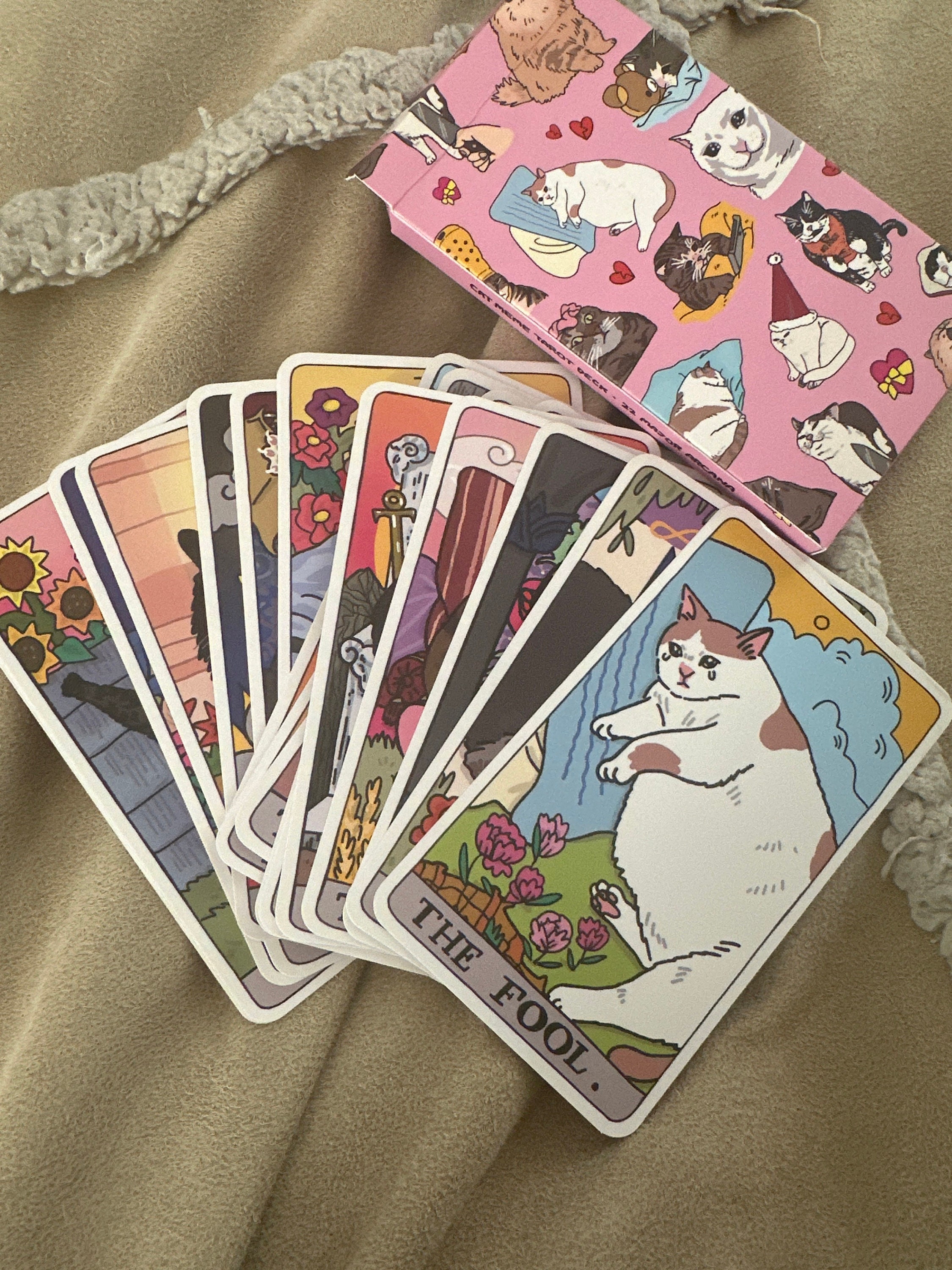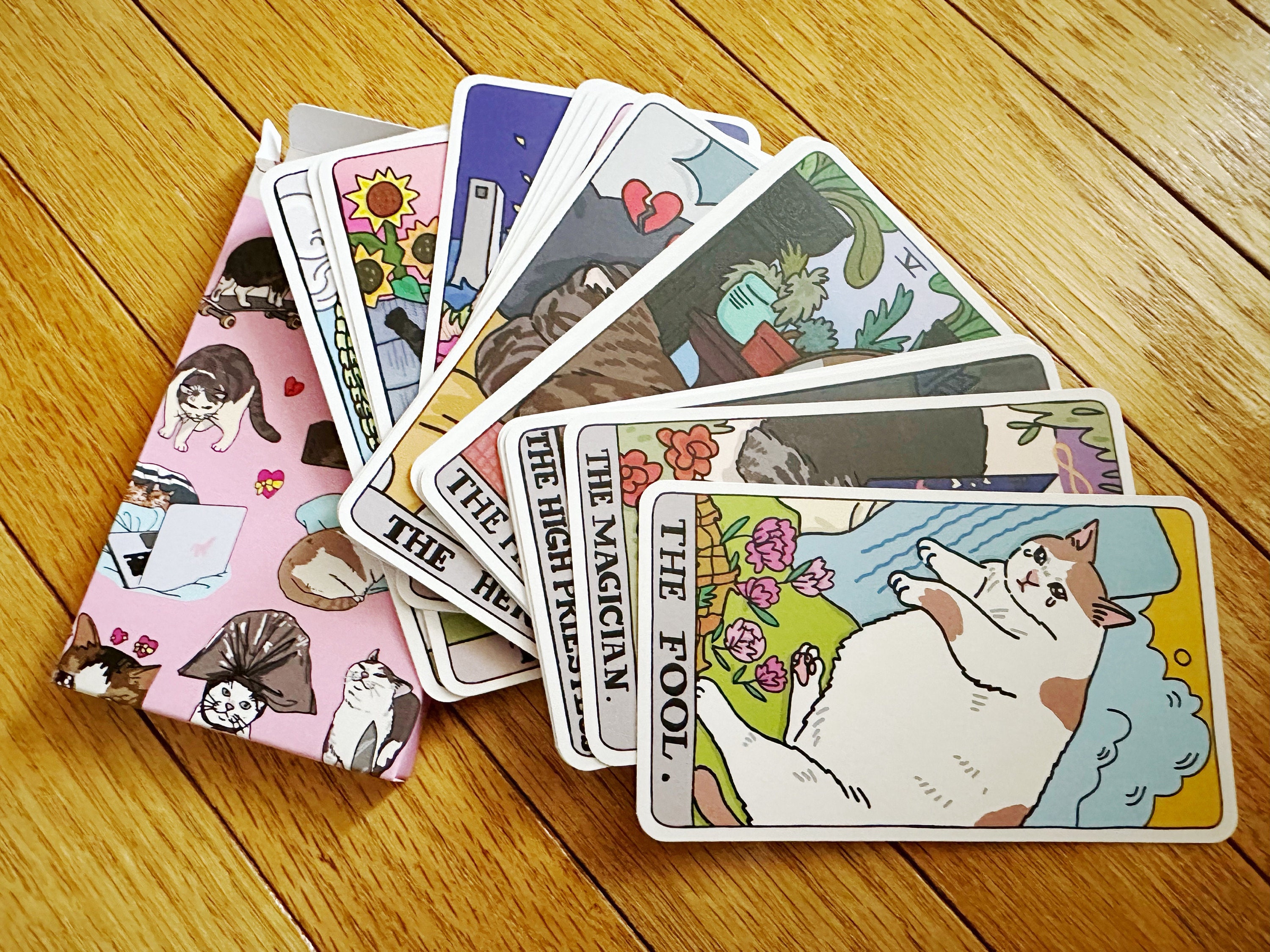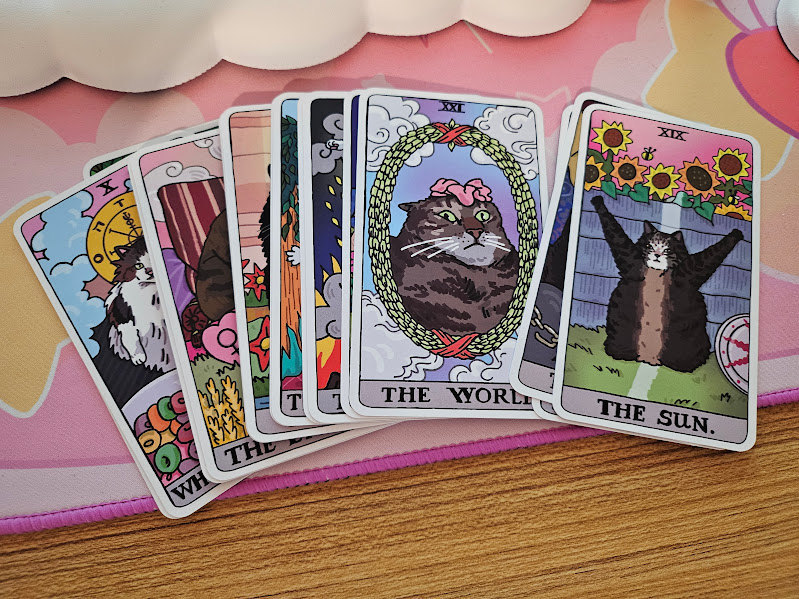 〰️ Whimsical and vibrant Cat Memes Tarot deck from Chonky Goods designed by Ping Hatta. Comes with a 22-card Major Arcana deck and card box.