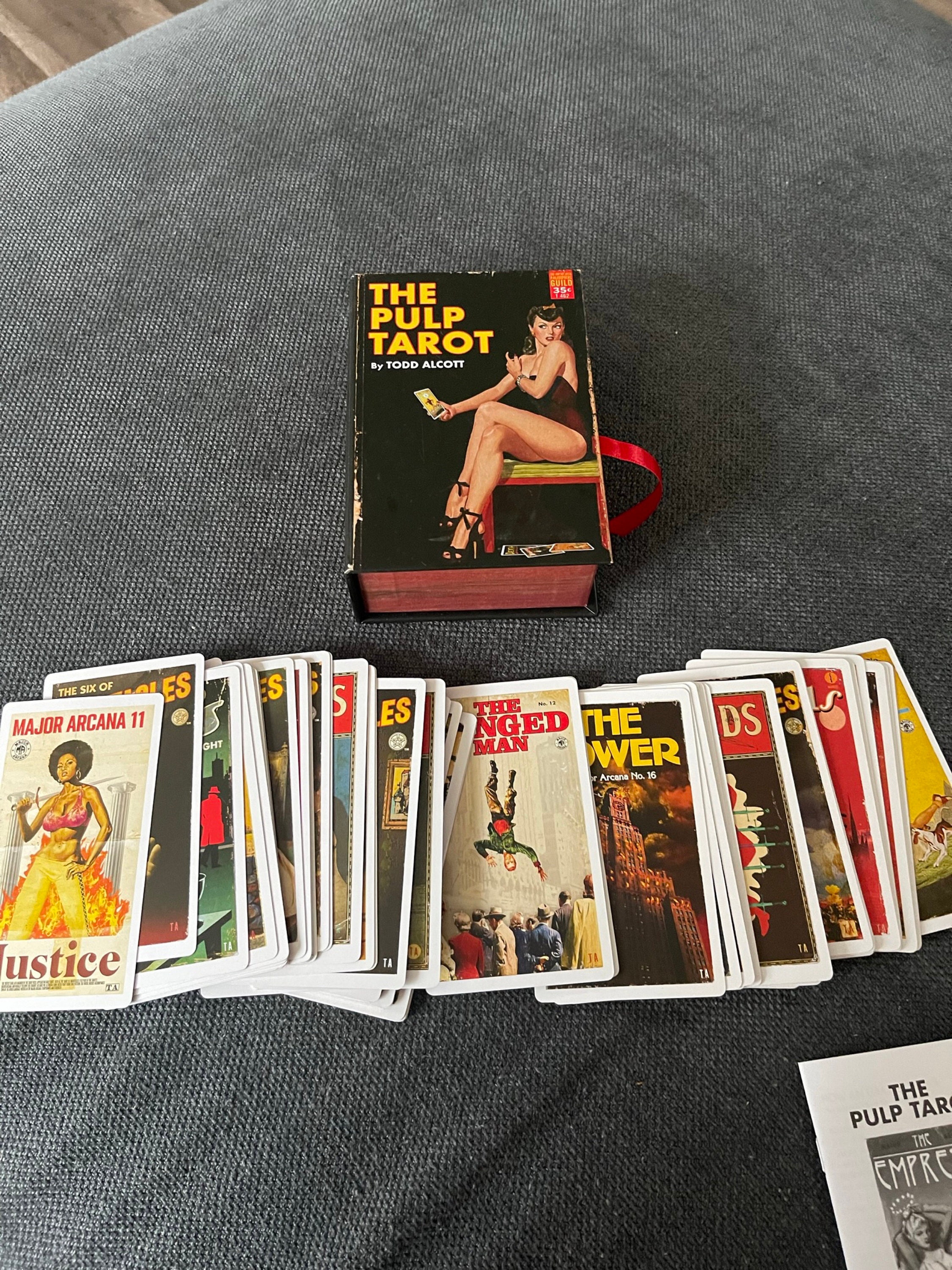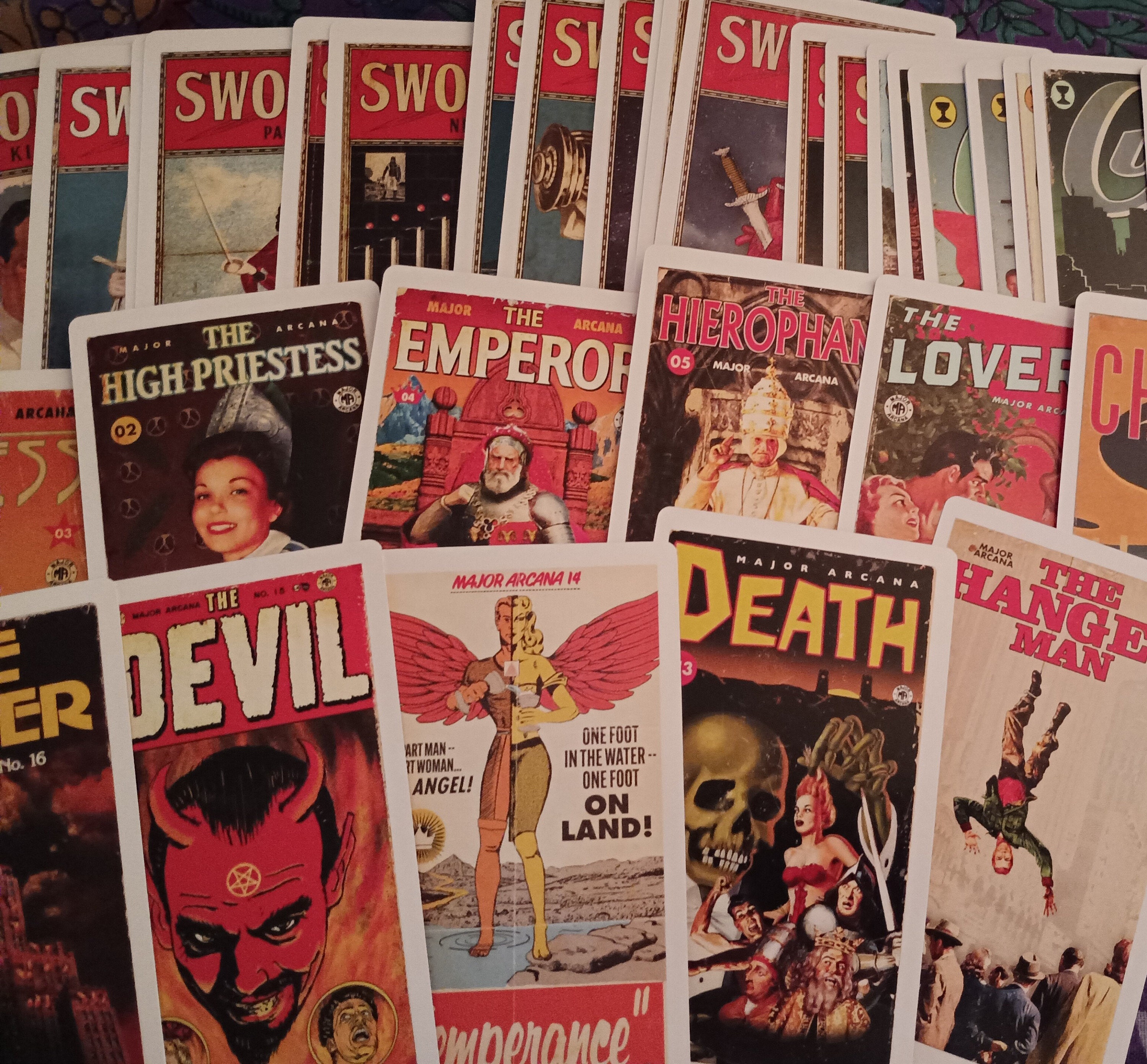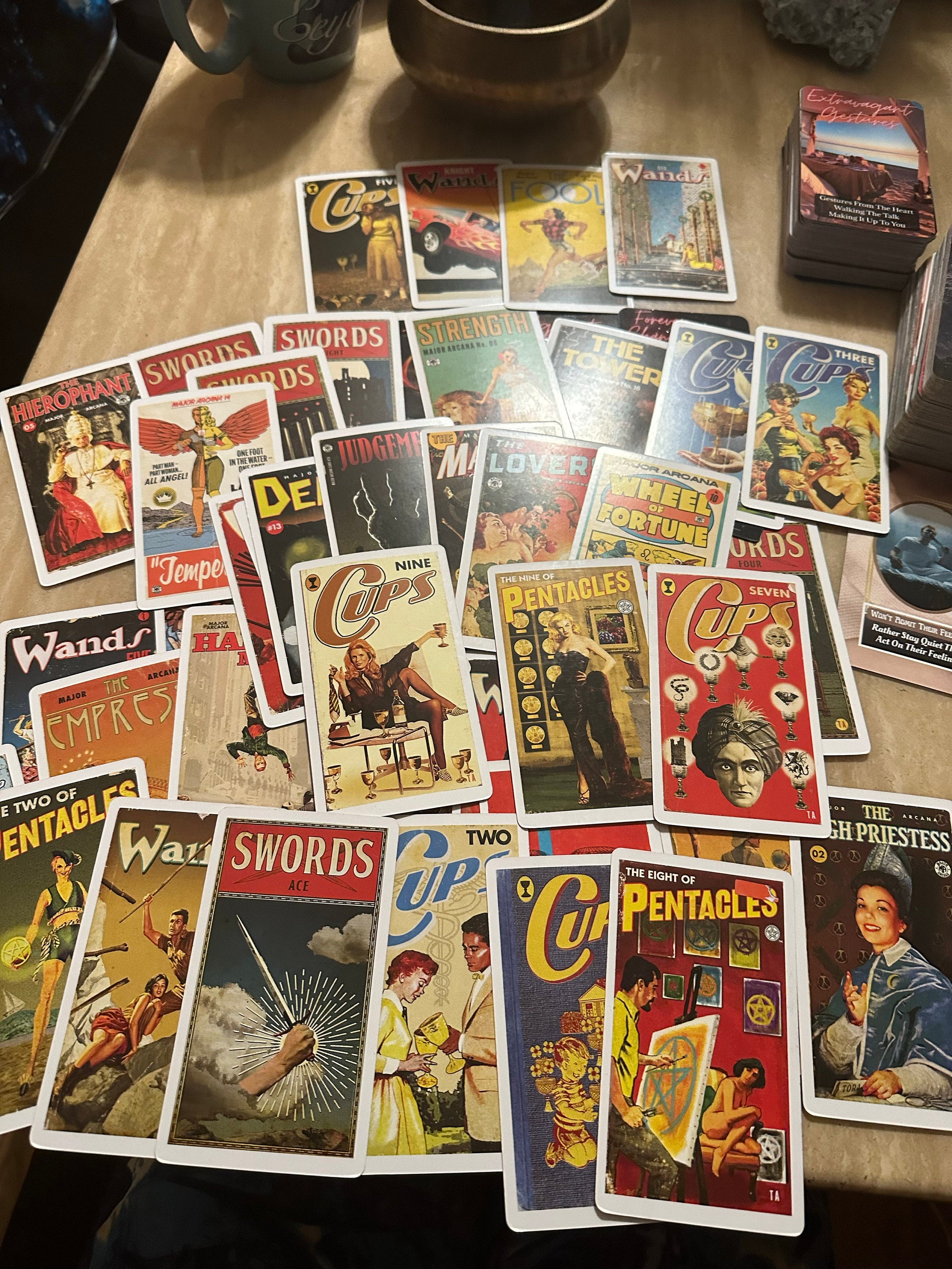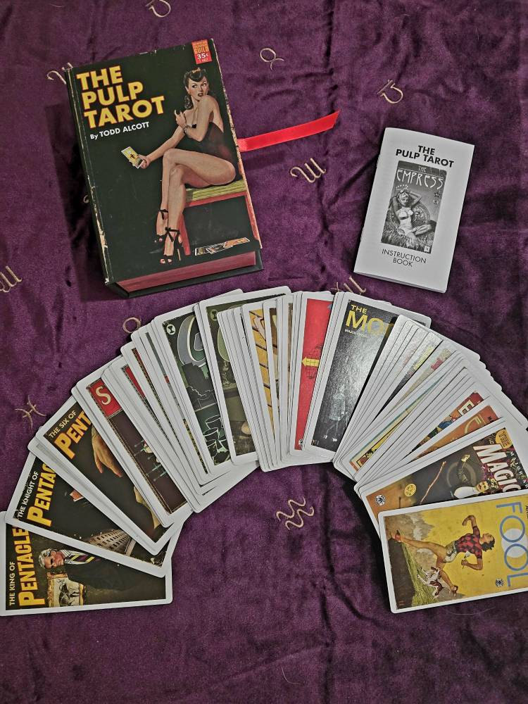 This project has been a very long time aborning. I've been interested in the Tarot as both an oracle and as a piece of design for decades. Back in the 1980s, I started to design a new deck, painting huge new images based on the artistic trends of the day. Soon, the enormity of the task overwhelmed me and I abandoned it. More recently, my visual art has been centered around creating new work based on midcentury designs, incorporating and manipulating existing images from 20th-century pop culture with an emphasis on the startling, dynamic paintings of classic pulp fiction covers. The Pulp Tarot expands upon that work, taking 70 years of pop-culture ephemera and putting it into a Photoshop Cuisinart to create a new Tarot deck that approaches the classic images of the Rider-Waite-Smith deck from the point of view of this modern cultural blender. Inspiration for the cards is drawn from everything from late 19th-century dime novels to 1970s exploitation movie posters, creating a rich, complex conversation between the arcane symbols of the Tarot and the sensationalist world of the pulps. This is a COMPLETE DECK, all 78 cards, plus a booklet describing my choices and process.