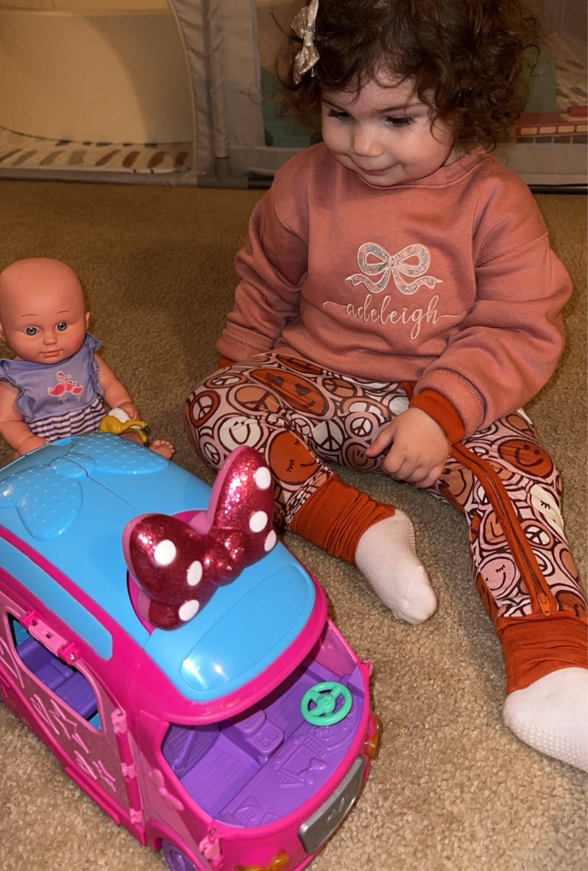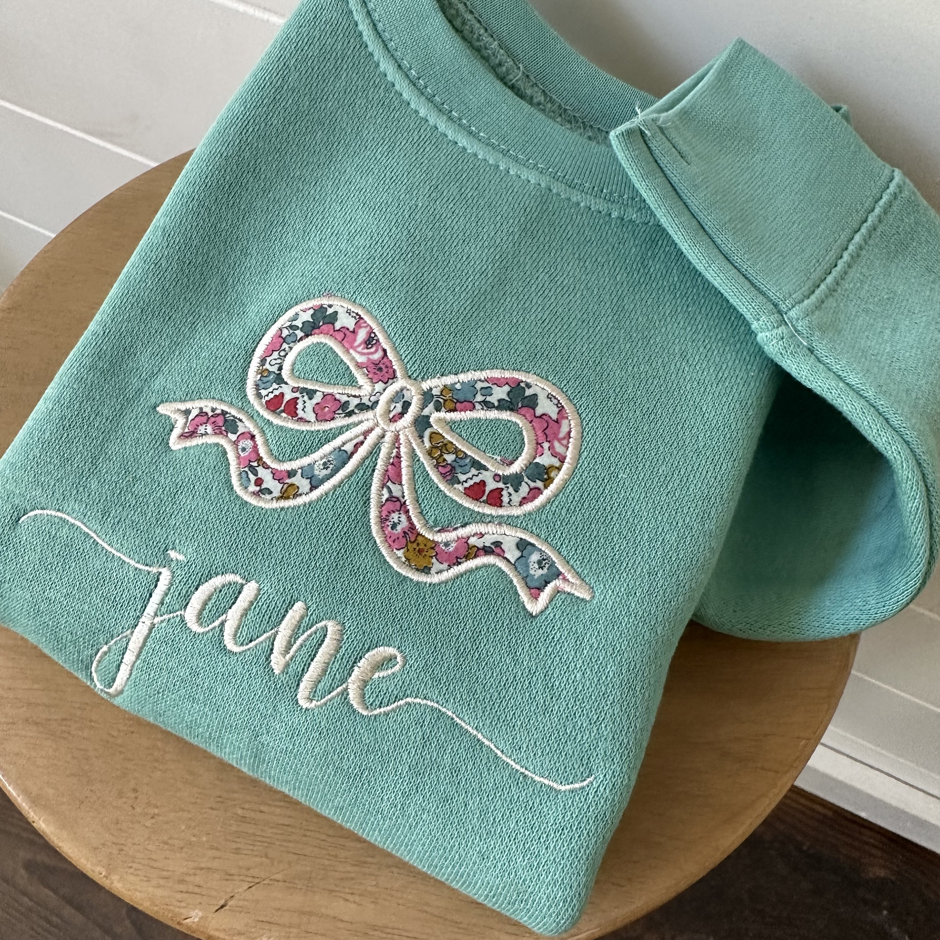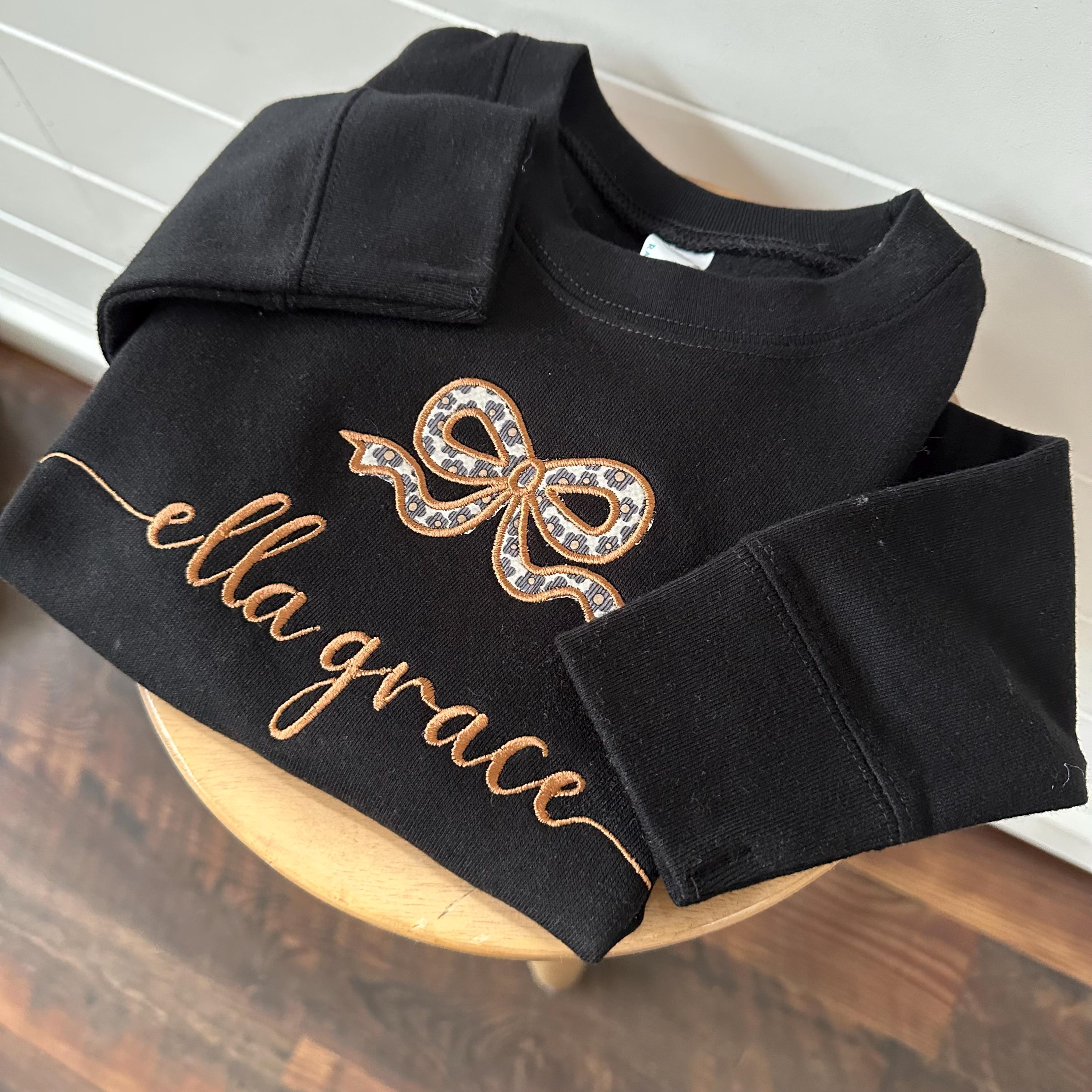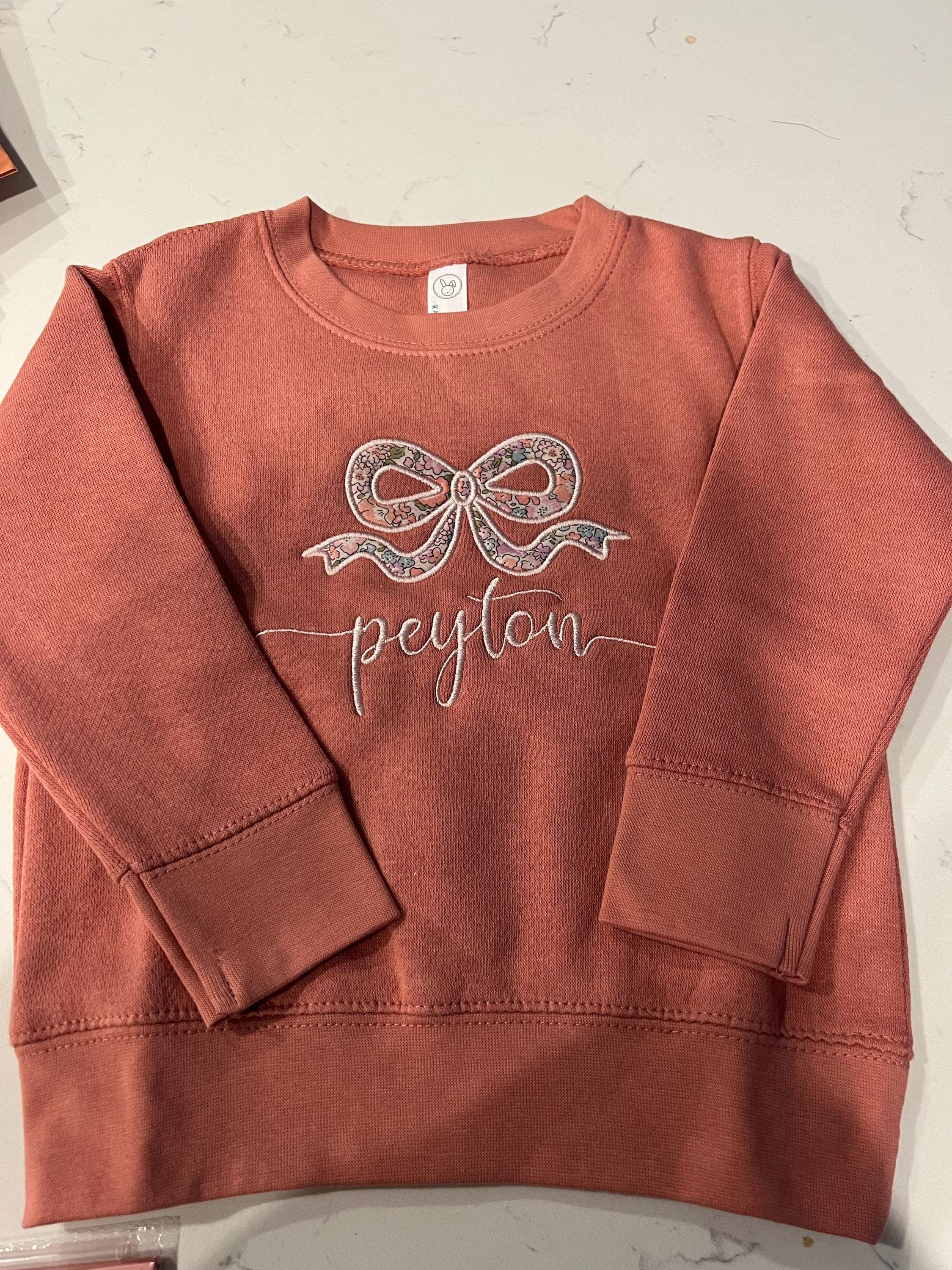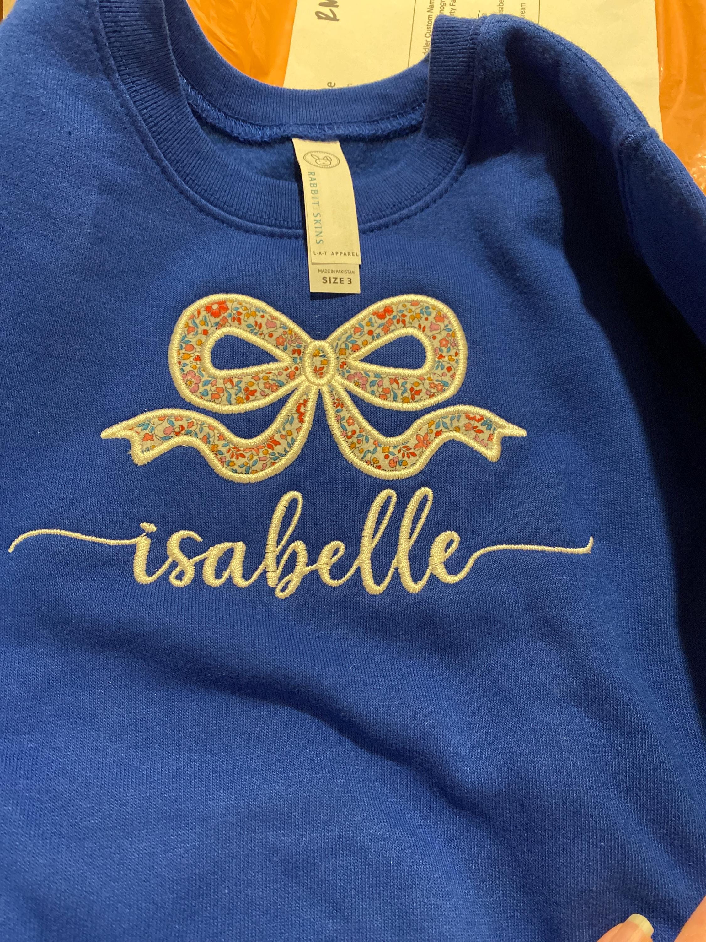 Our sweatshirts are made of 60% cotton and 40% polyester. Each sweatshirt has a bow and name embroidered on the bottom. Please leave the thread color for the name and bow outline.