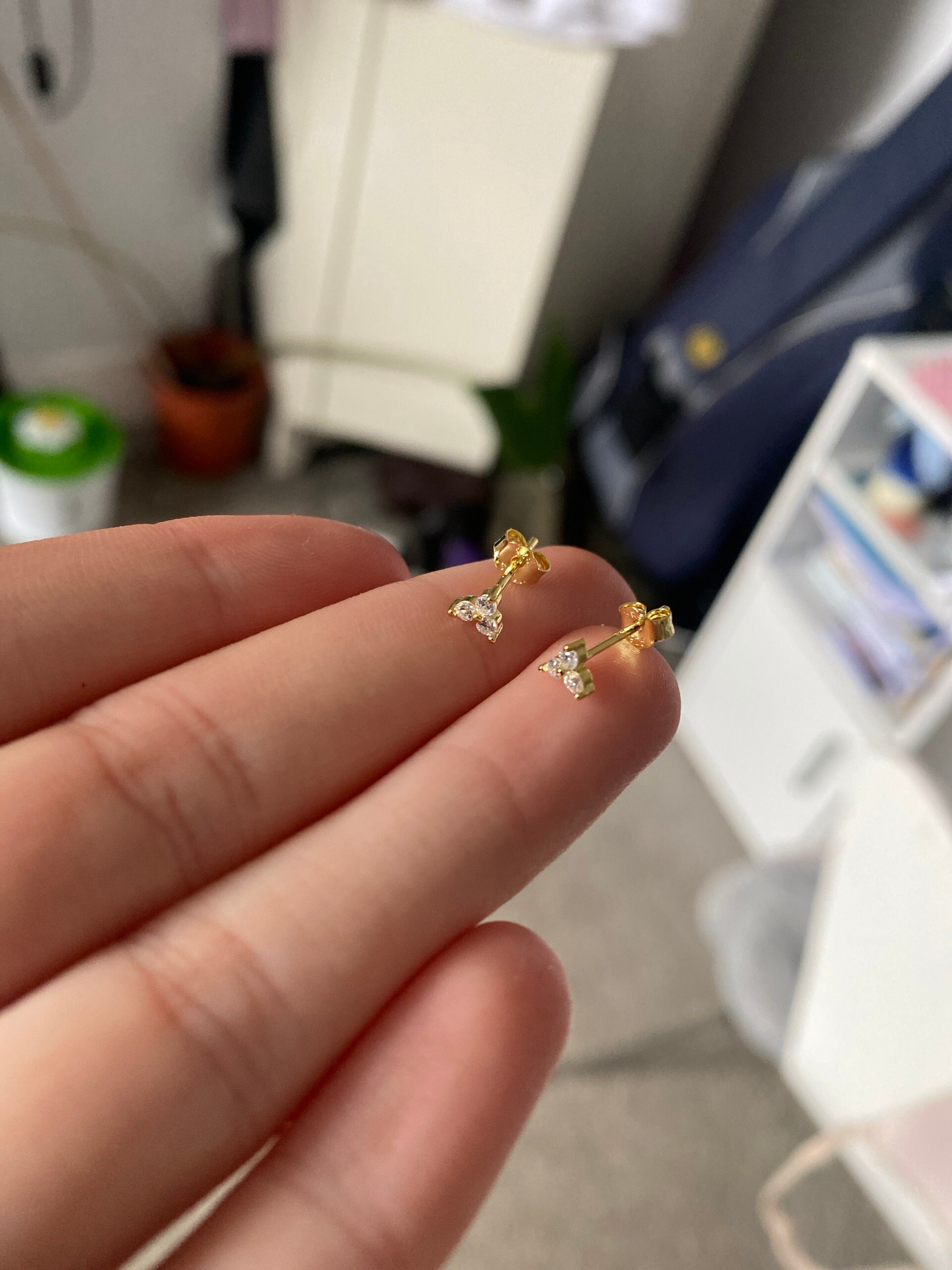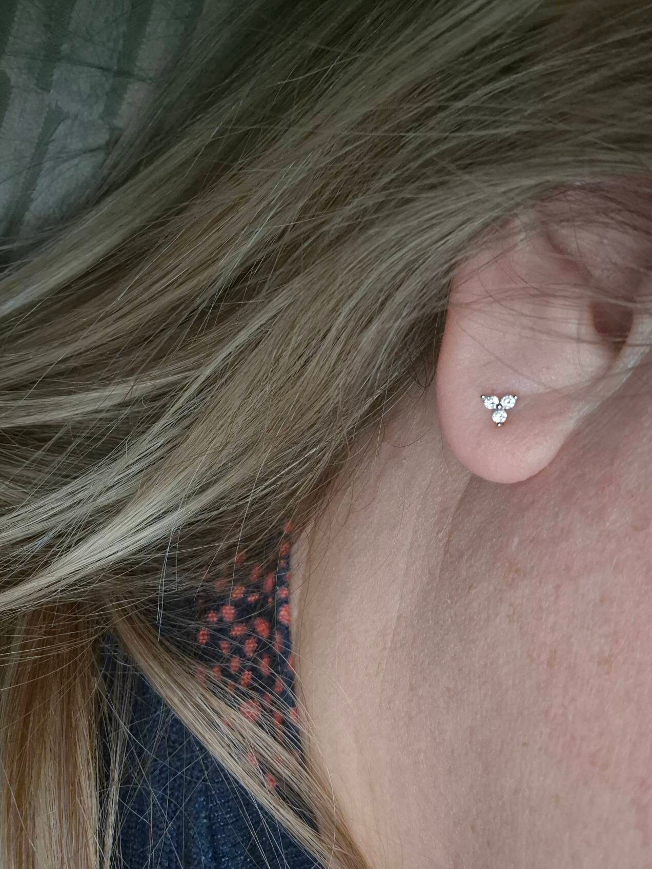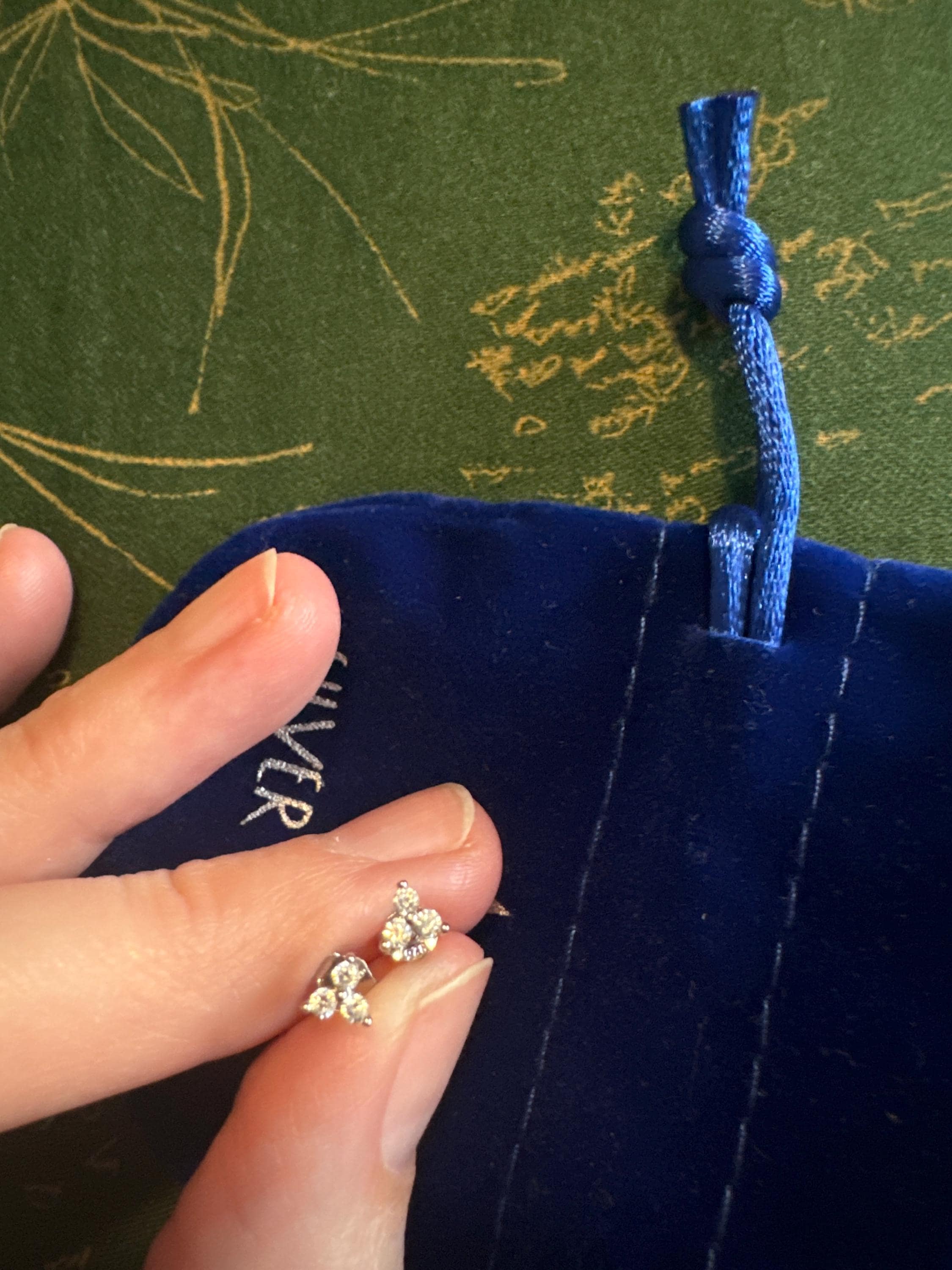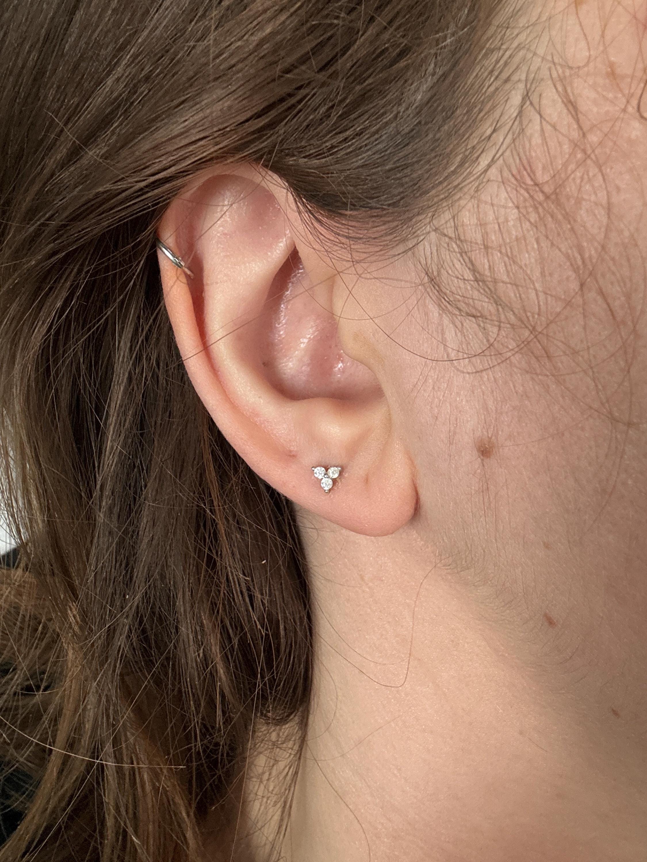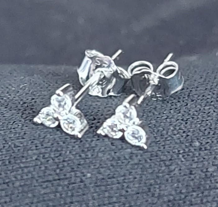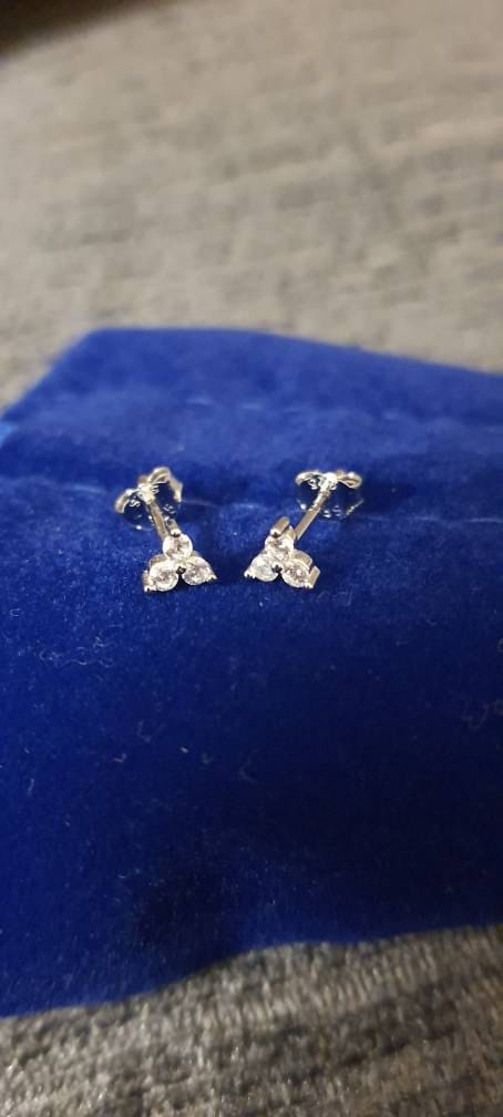 Extra small 3-point trio studs in sterling silver with sparkling CZ crystals, simple and minimal, geometric and understated.