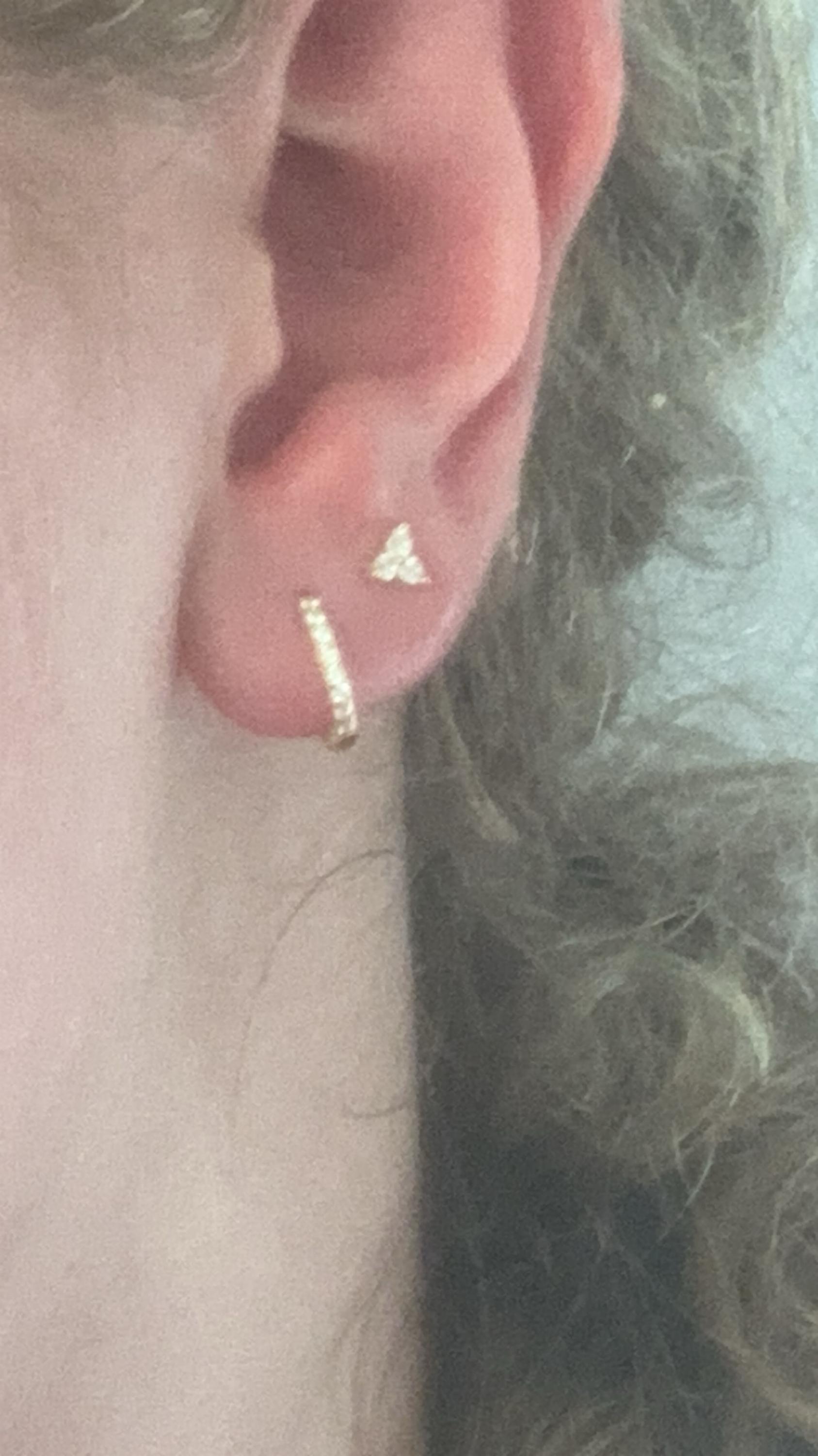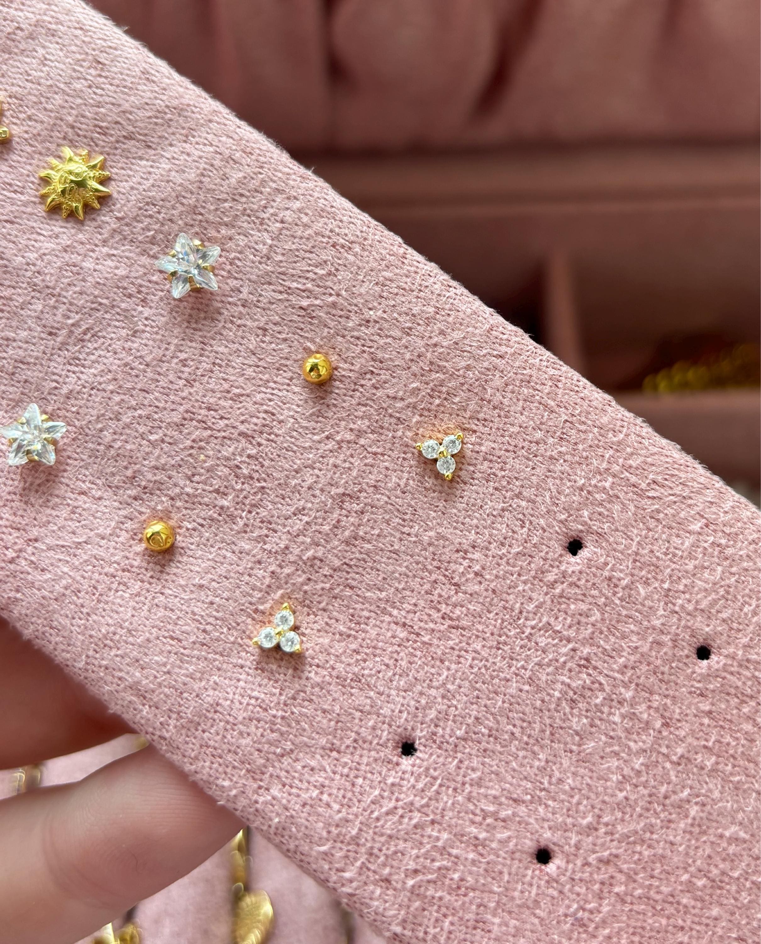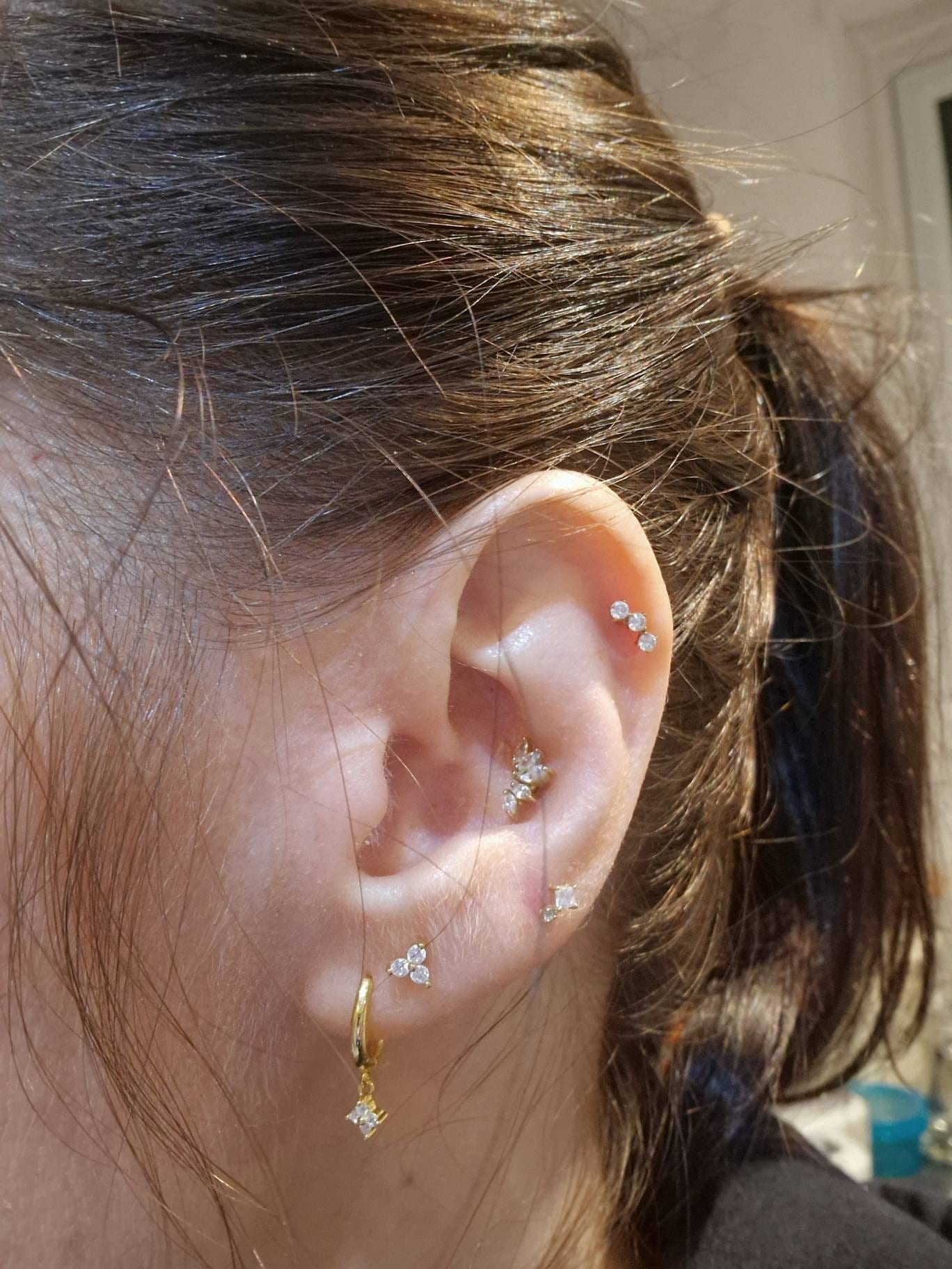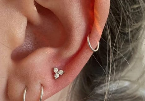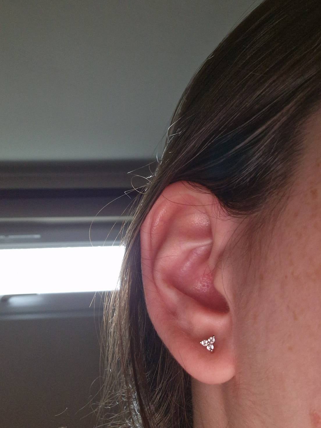 Extra small 3-point trio studs in sterling silver with sparkling CZ crystals, simple and minimal, geometric and understated.