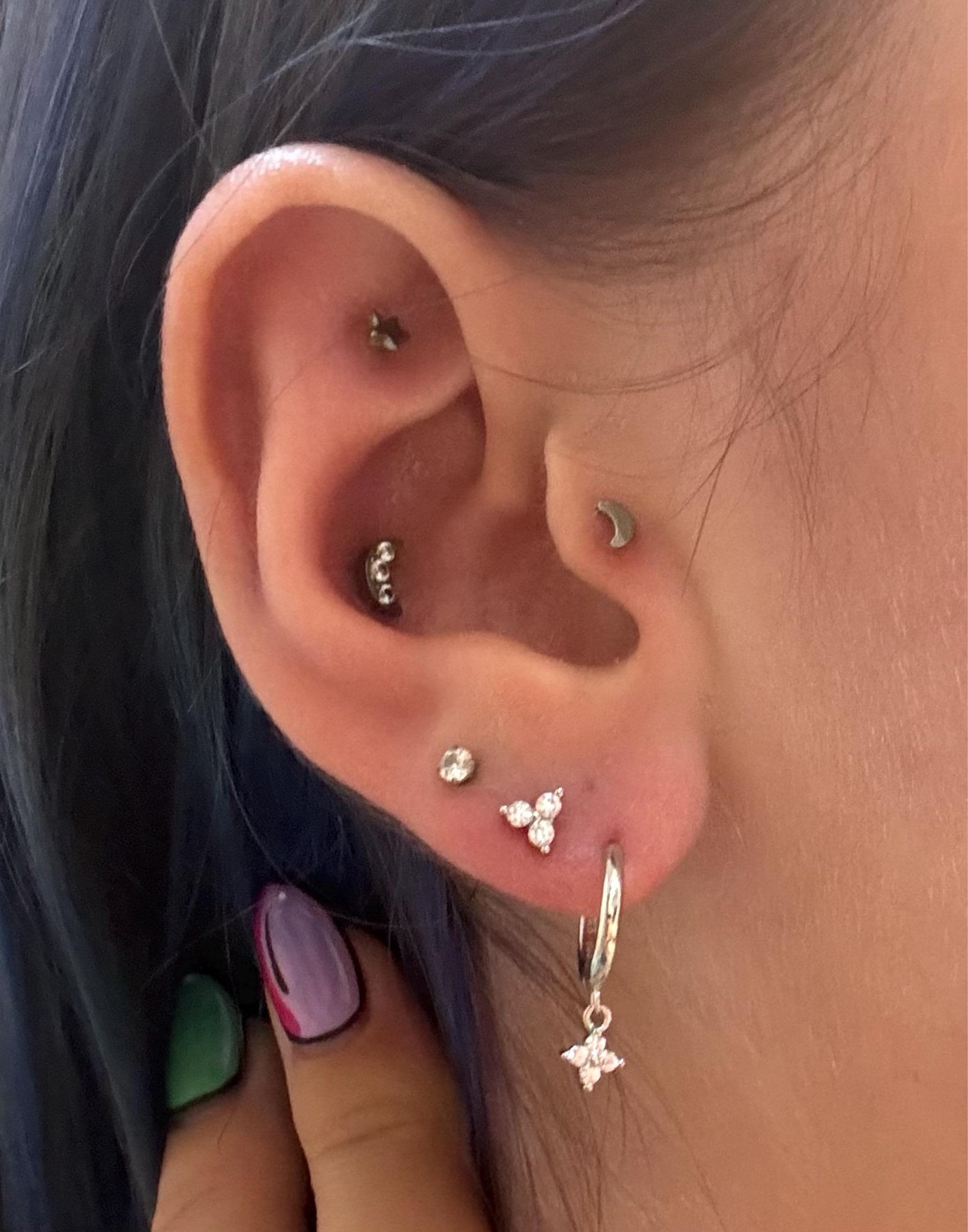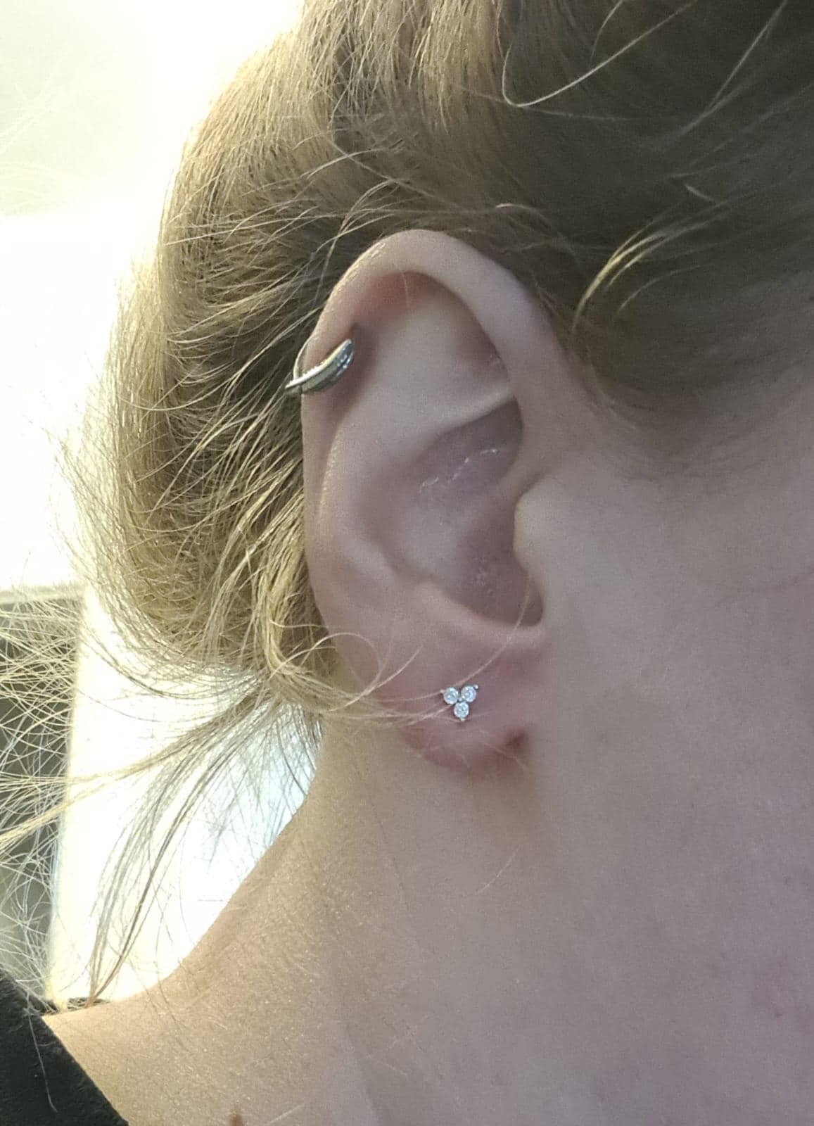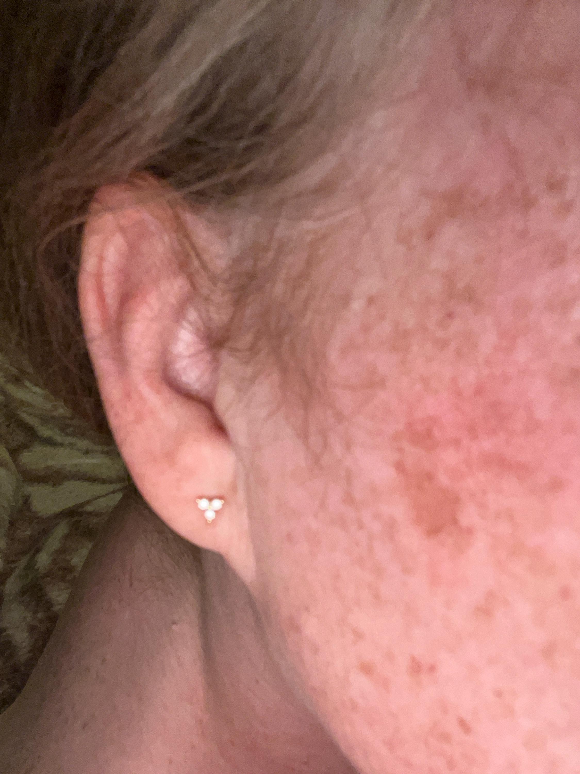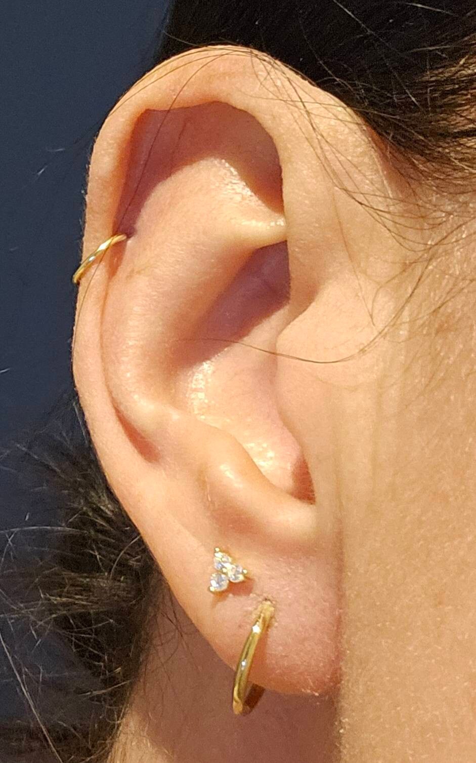 Extra small 3-point trio studs in sterling silver with sparkling CZ crystals, simple and minimal, geometric and understated.
